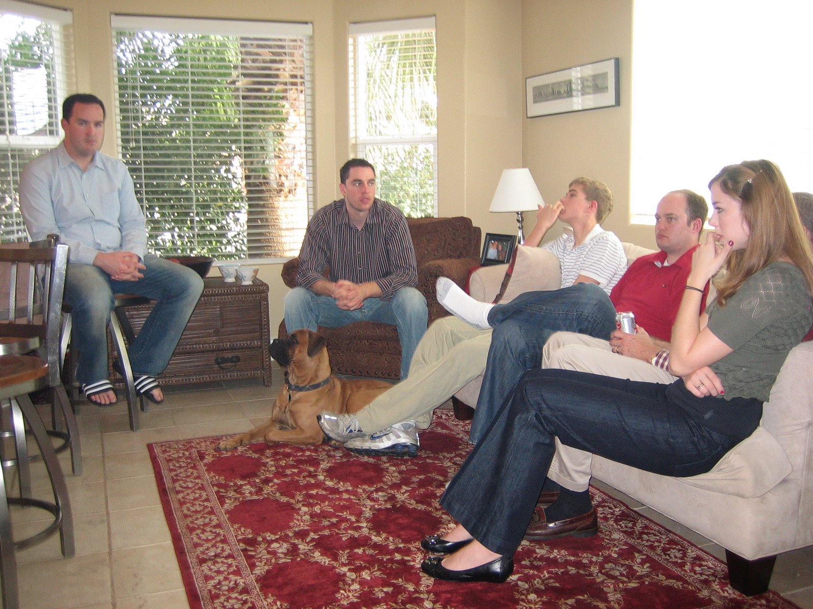 Family photo, Cleo looks like she is ready to eat Peter up. Peter, Julia and Cleo on the floor, and from left Dad, Mom, Lauren, Jason, Paul, Steve and white pasty calves, I mean me.